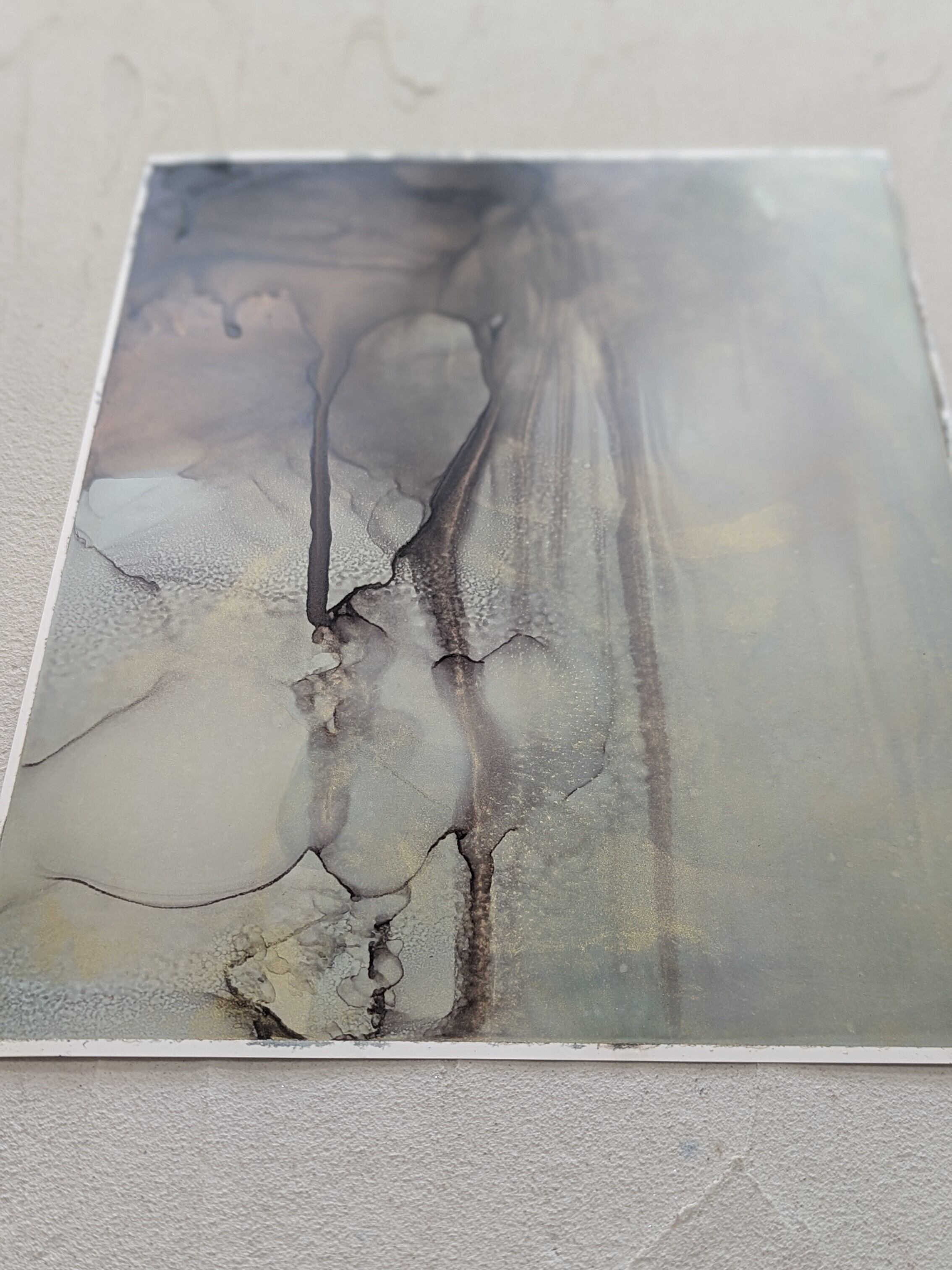 アルコールの動きとインクの混ざり合い、メタリックの広がりを風の力を借り、一瞬一瞬を捉えていくartです。